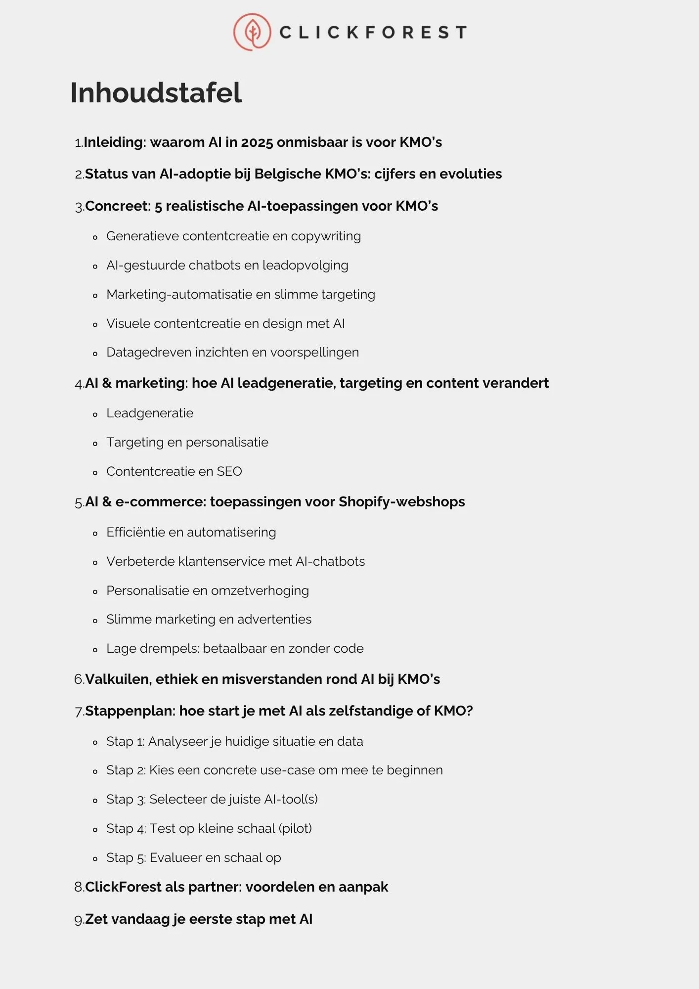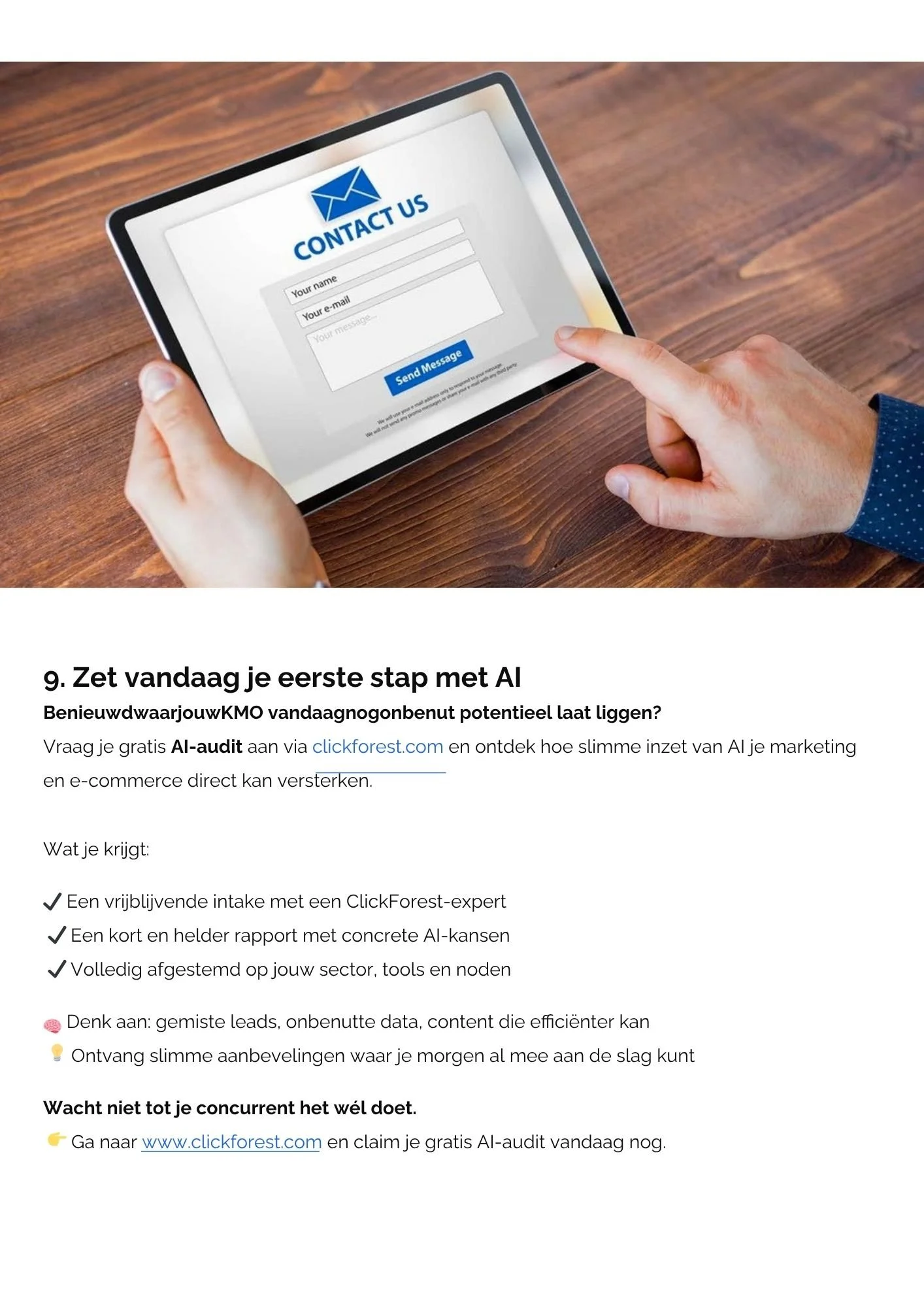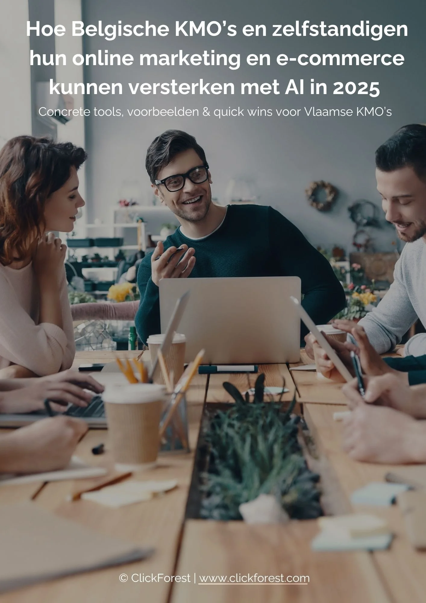 Je kan meteen aan de slag met een aantal AI-tools, of vrijblijvend een gratis AI-audit aanvragen via ClickForest.com. Daarin bekijken we samen waar jouw onderneming vandaag AI-kansen laat liggen.
