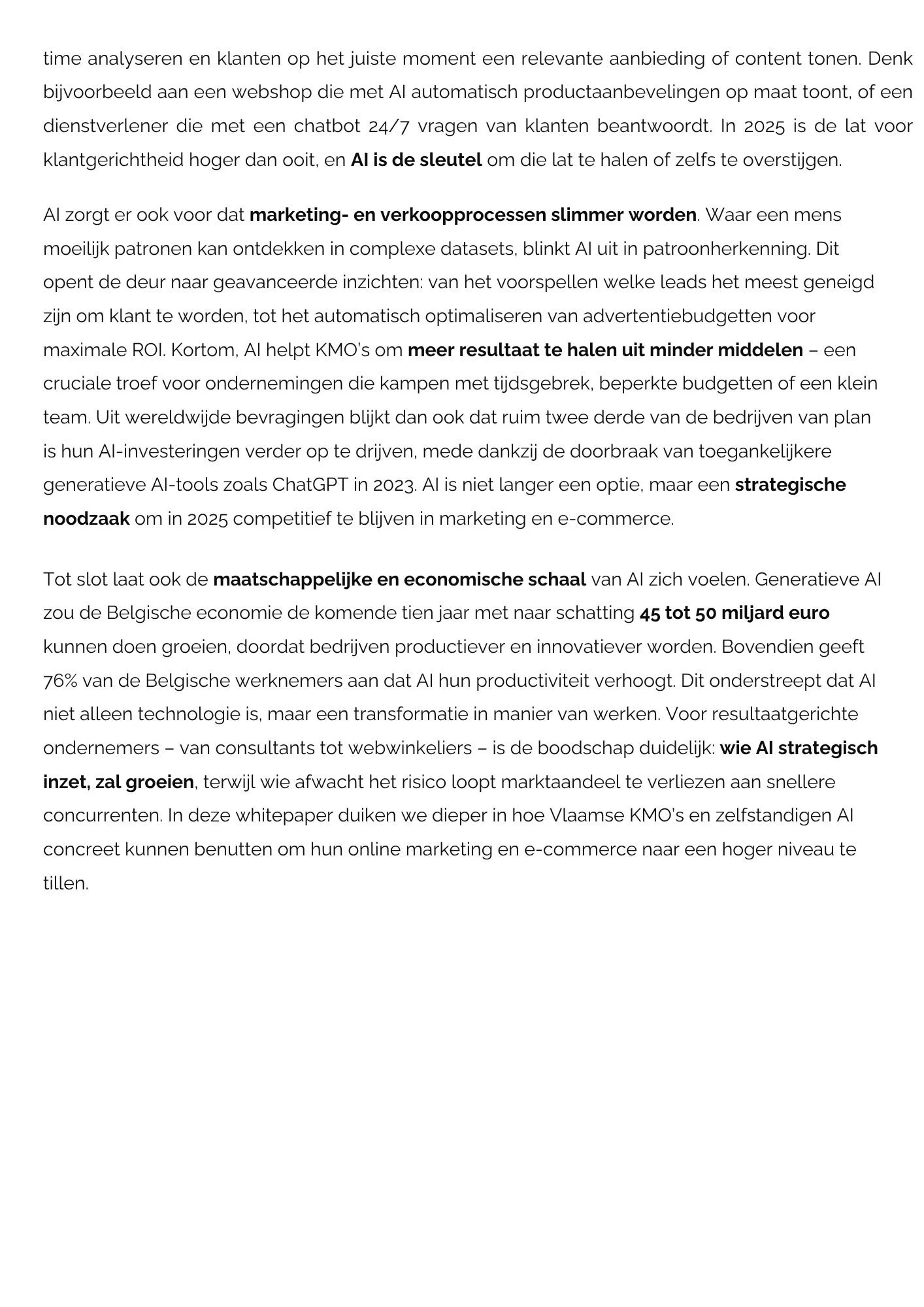 Voor grote bedrijven met een intern data science-team is deze whitepaper te basic. De inhoud is gericht op kmo’s die snel resultaat willen met beperkte middelen.